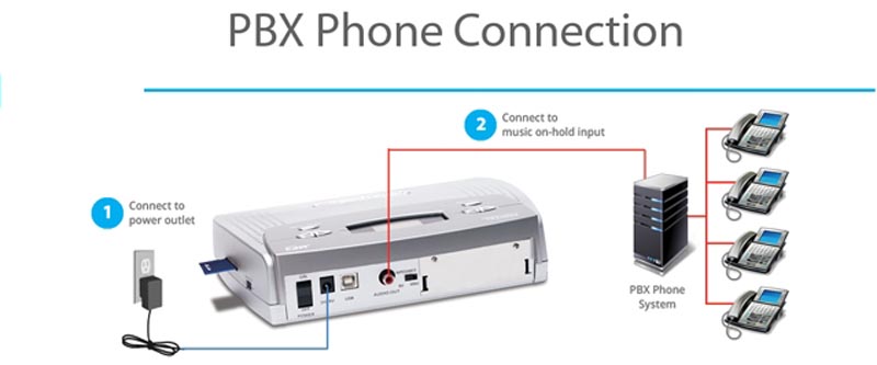 For the direct music on hold input, the music on hold player simply plugs right into the music on hold input on the IP phone system. This is the preferred option, for reasons outlined below.